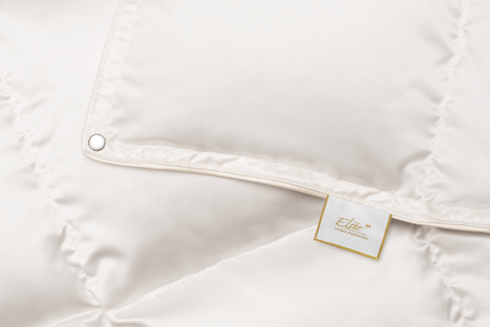 Sehr luxuriöse Bettdecke gefüllt mit neuer silberweisser Daune kanadischer Wildgans, 100% Daune, Qualitätsklasse 1. Satinbezug aus 100% Seide in Beige.