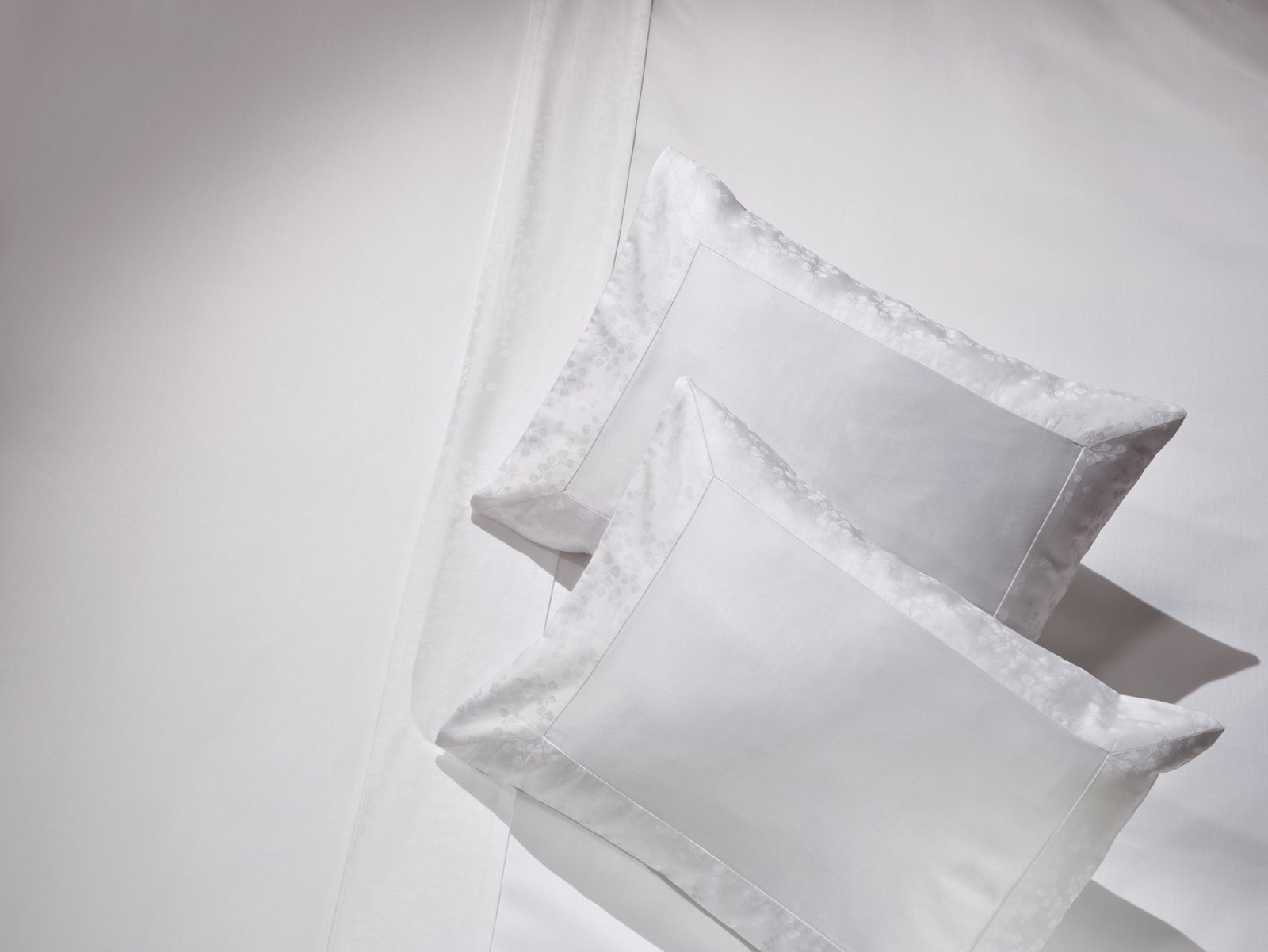 Die Garnitur Figaro aus 600-fädigem gezwirntem Baumwollsatin ist mit einem angedeuteten Stehsaum-Rand aus 300- fädigem Jacquard-Baumwollsatin versehen und kombiniert Subtilität und Eleganz in einem Ton-in-Ton-Finish.