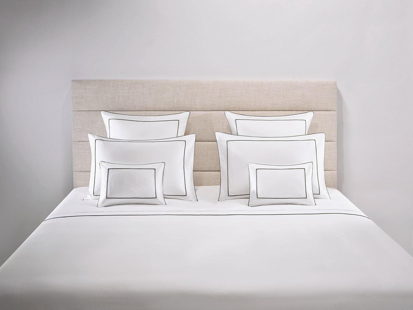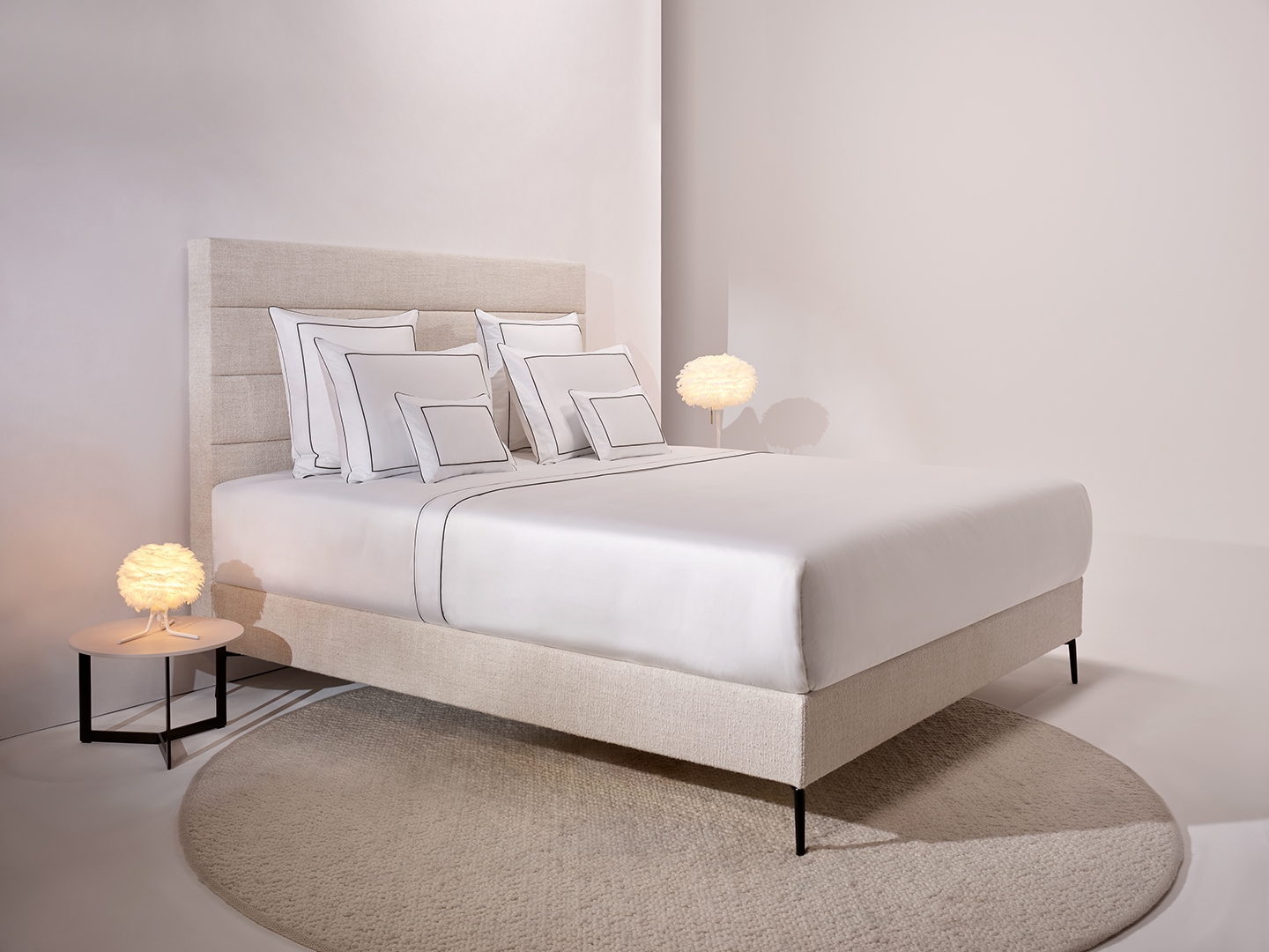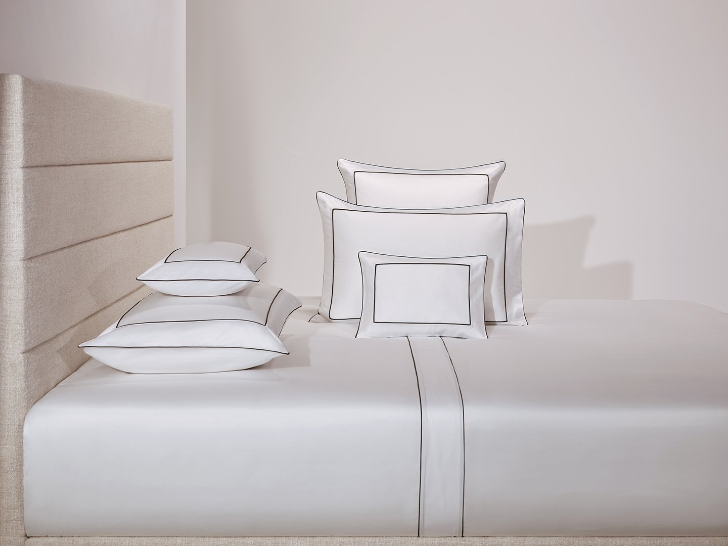 Die Garnitur Traviata aus 600-fädigem gezwirntem Baumwollsatin ist mit einer leicht geschwungenen Doppelpaspel verziert, die subtil und raffiniert ein Volant imitiert.