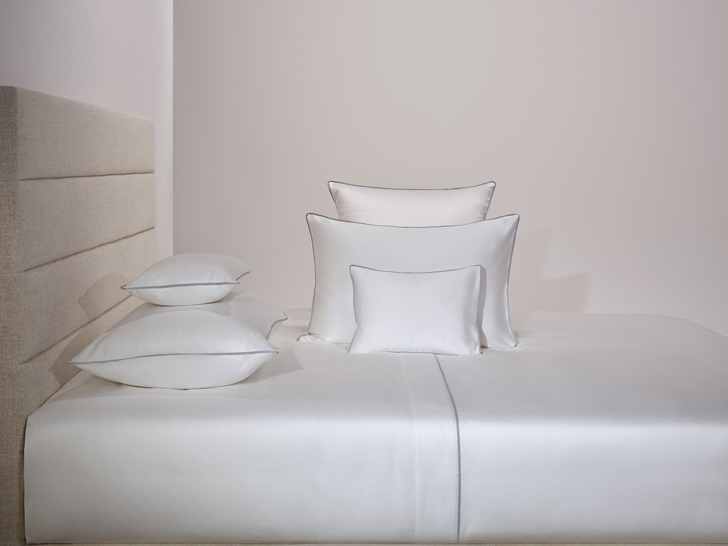 Crafted from 600-thread-count cotton satin, the Hippolyte set is adorned with a cotton piping embellished with cross-stitching, adding a subtle texture.