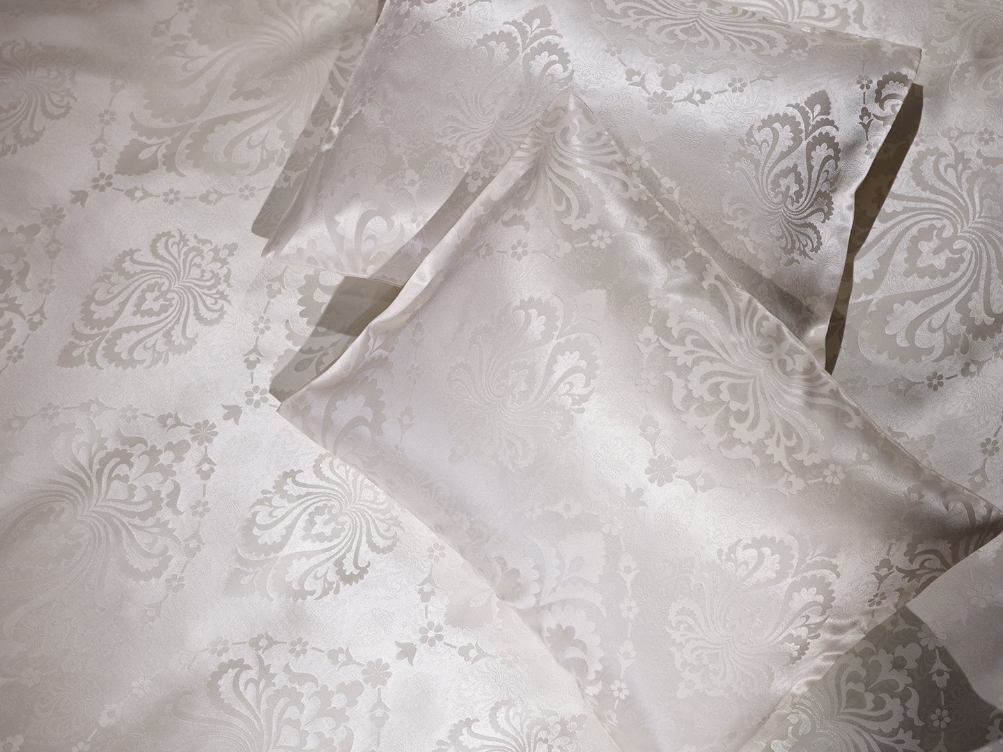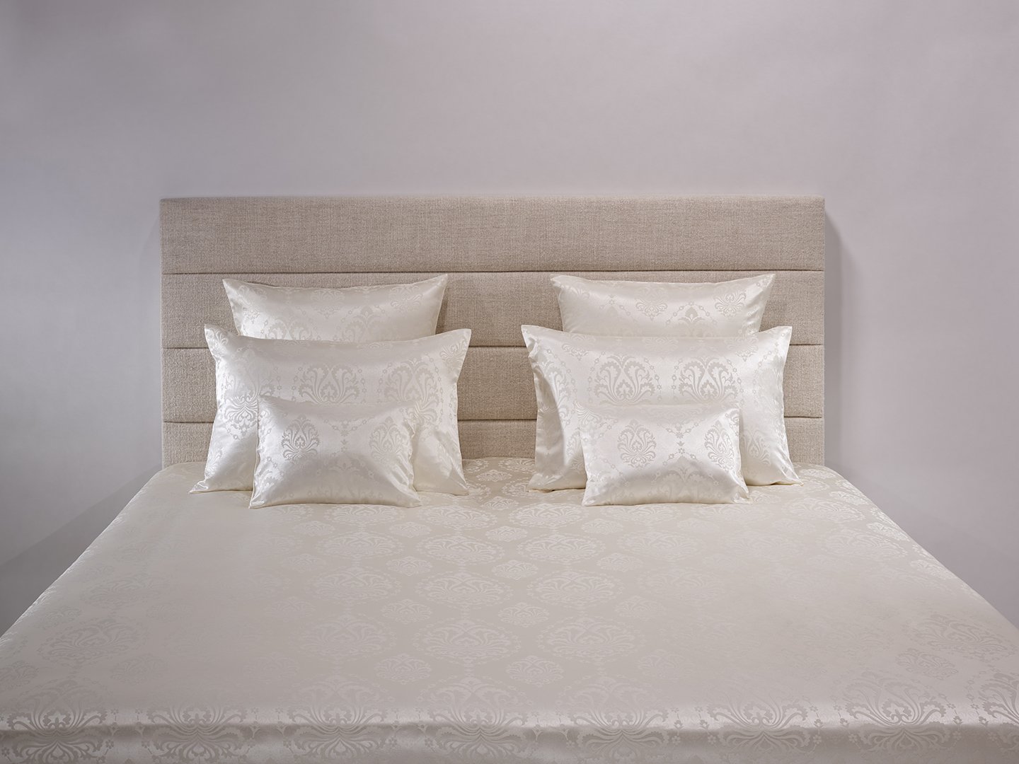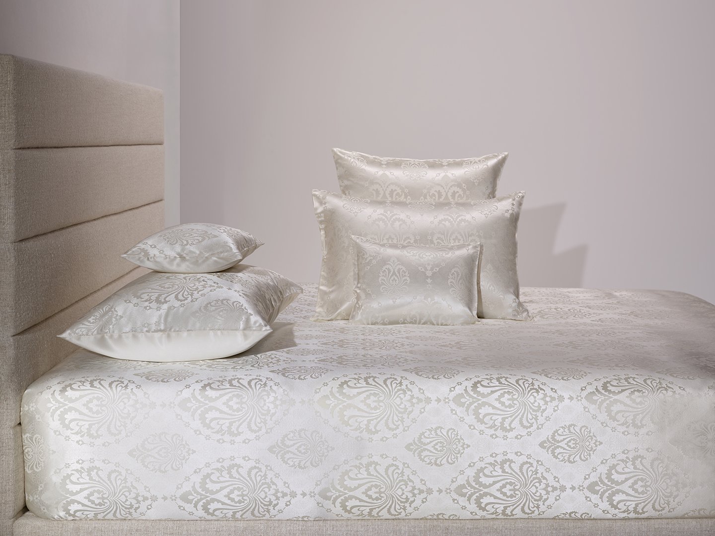 La parure Elixir, en soie 29 mommes est proposée en plusieurs finitions : unie ou en combinaison, d’un côté jacquard et de l’autre uni. Un rêve de douceur et d’élégance. Disponible avec ou sans volant.