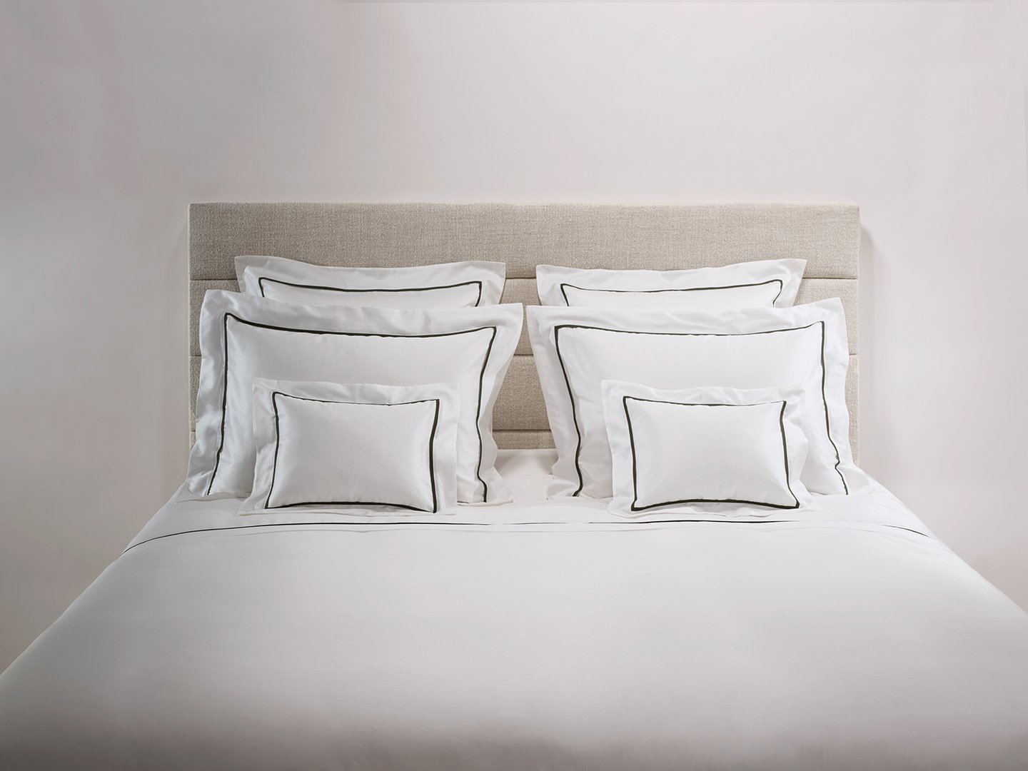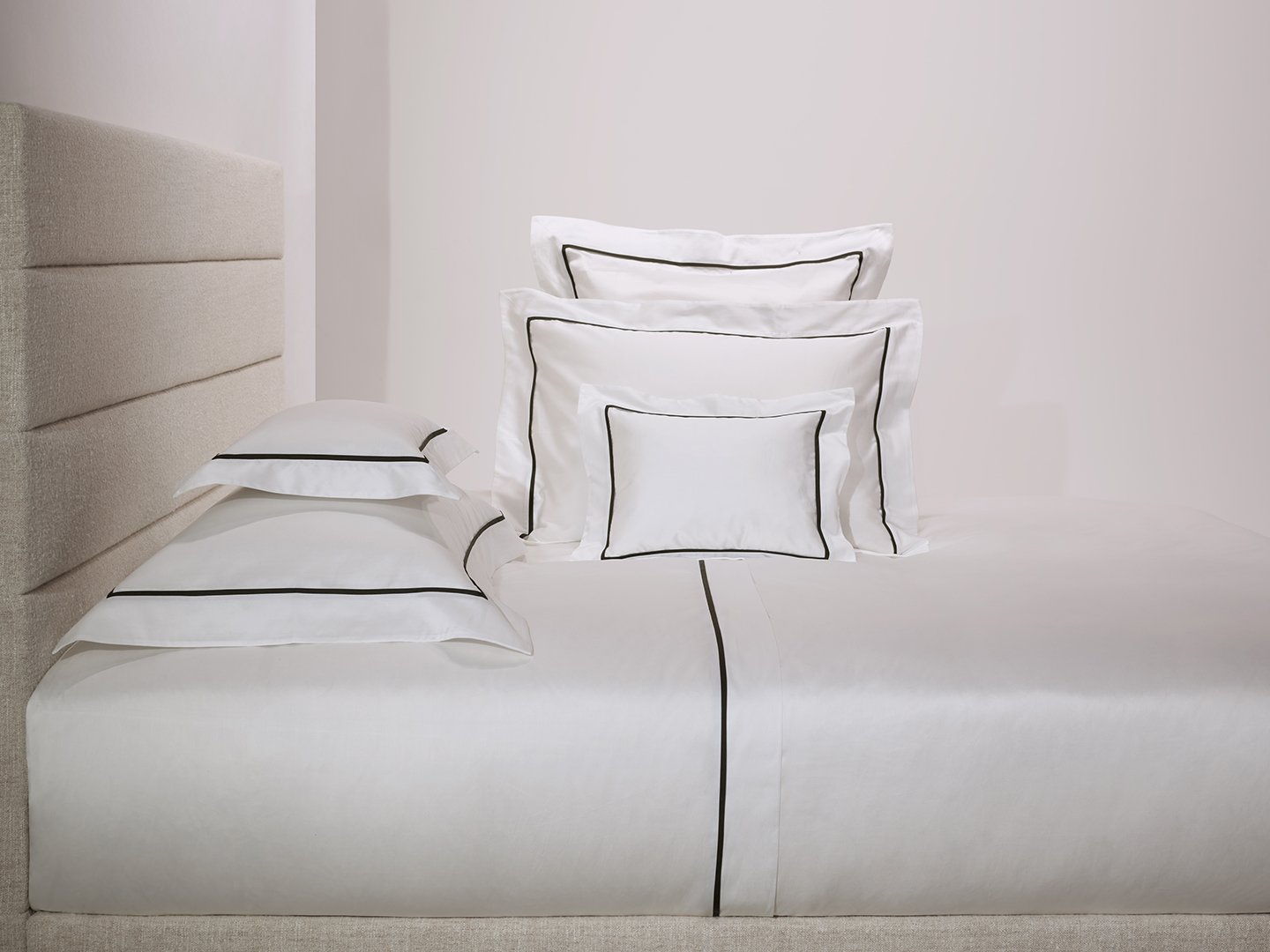 Realizzato in raso di cotone 600 fili ritorti, il completo Aïda è valorizzato da un volant ornato da un nastro a contrasto in raso 300 fili opaco, che dona profondità ed eleganza.