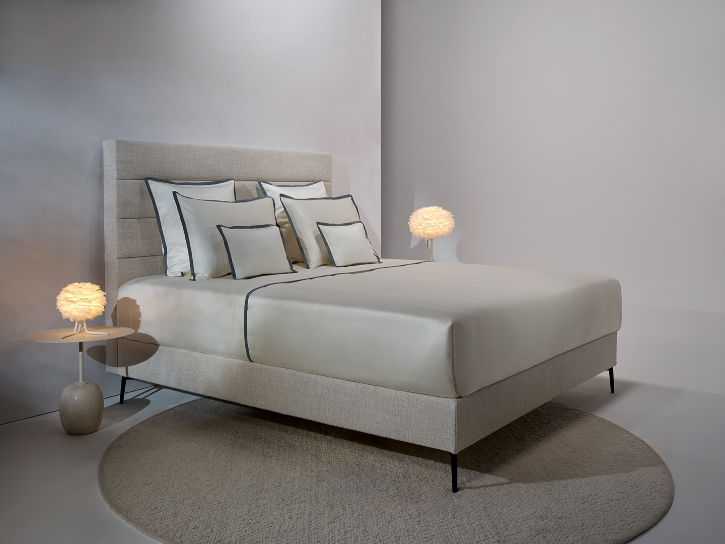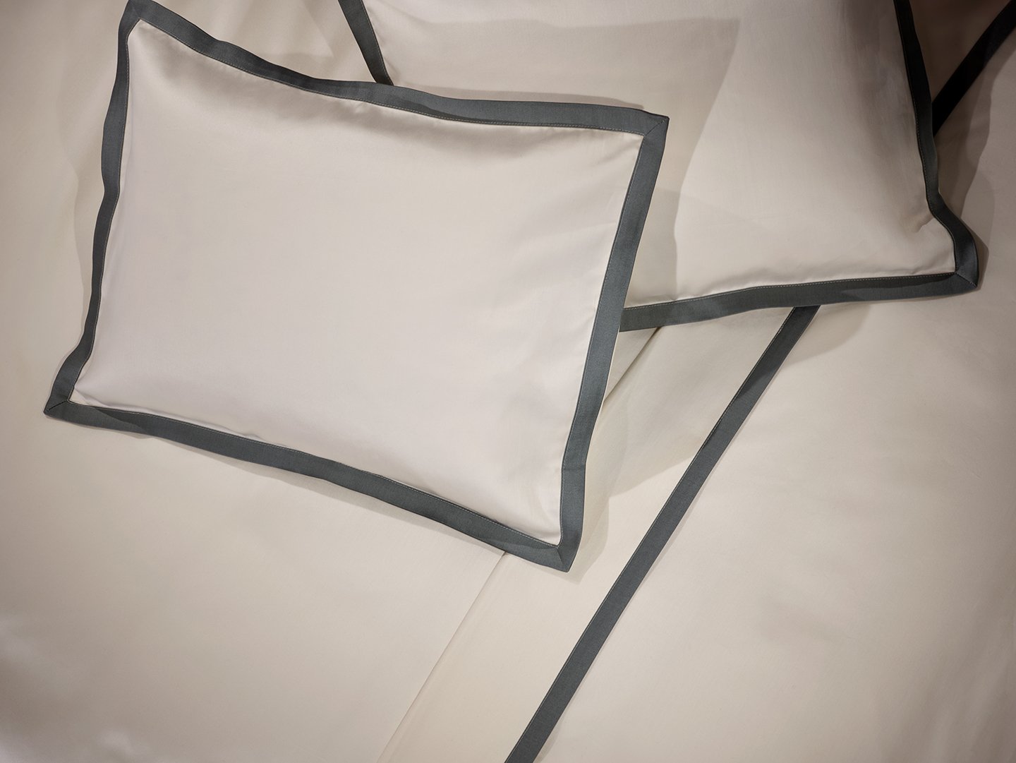 Il completo Don Giovanni, in raso di cotone 600 fili ritorti, si distingue per un mini volant a contrasto in raso di cotone lucido 300 fili, per un look moderno e sobrio.