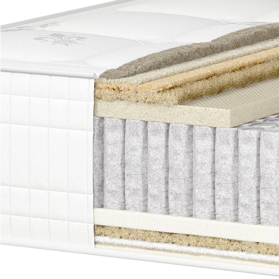 Dotato di una pregiata imbottitura 100% naturale (crine biondo, lattice naturale, fibre SeaCell®, cotone biologico e lana svizzera), il Flamenco segue le stagioni con un lato estivo in seta Tussah e lana d’agnello e un lato invernale in cashmere, denso e avvolgente.